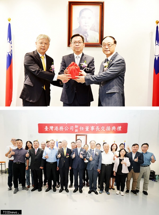 ▲上圖:臺灣港務公司卸、新任董事長交接印信。卸任董事長李賢義(左),監交人交通部常務次長林國顯(中),新任董事長周永暉(右)。(圖:臺灣港務公司提供) 下圖:臺灣港務公司卸、新任董事長交接典禮合影。前排左二起:總經理王錦榮、前任總經理陳劭良、卸任董事長李賢義、監交人交通部常務次長林國顯、新任董事長周永暉及第一任董事長蕭丁訓。(圖:臺灣港務公司提供) 臺灣港務股份有限公司(下稱港務公司)昨(十三)日在交通部次長林國顯主持下,舉辦「卸、新任董事長交接典禮」,由原任董事長李賢義將印信交接給新任董事長、前交通部觀光署署長周永暉。