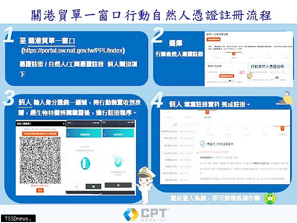關務署為提升便民服務,關港貿單一窗口自十月一日起,提供民眾以行動自然人憑證註冊服務。依據「關港貿單一窗口運作實施辦法」第六條規定,使用單一窗口申辦業務者應透過憑證提出註冊申請,且所有需憑證服務均須使用憑證登入後始能辦理。為配合內政部憑證管理中心推廣行動自然人憑證,今年五月二十二日單一窗口先針對原已註冊民眾,新增以行動自然人憑證登入服務,藉由民眾儲存於行動裝置的生物辨識功能,實現免插卡、免輸入密碼的數位身分驗證,不僅有效保護個人資料,亦降低身分被冒用風險。