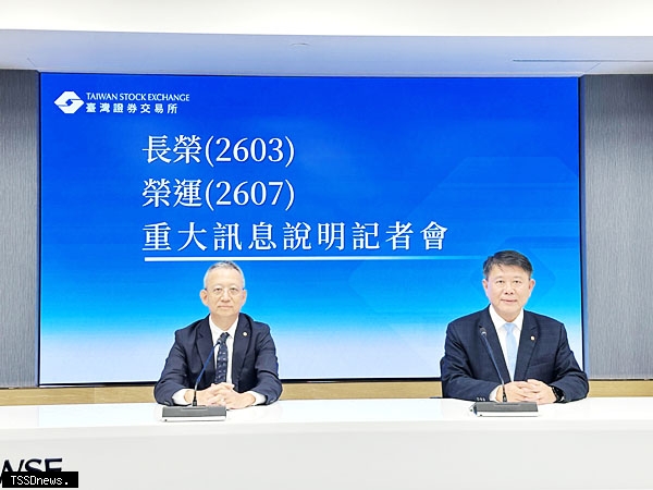 ▲長榮海運、長榮國際儲運同步發布重訊,由長榮海運財務部主管莫政平(左)、榮運總經理林振芳(右)說明。(圖:長榮提供)