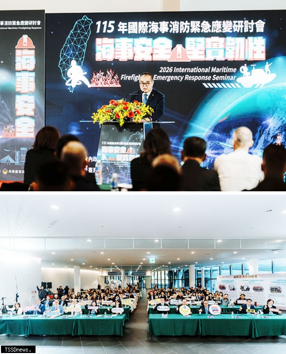 ▲上圖:港務公司行政副總經理高傳凱致詞。 下圖:115年國際海事消防緊急應變研討會現場合影。(圖:臺灣港務公司提供)