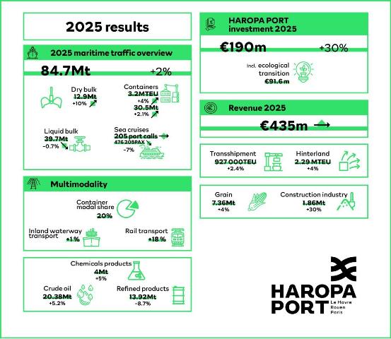 根據HAROPA PORT於1月21日公布的年度統計資料,2025年塞納河(Seine)港口廊道整體貨運量與貨櫃處理量均創下新高。在國際貿易與航運環境仍處於高度不確定的情況下,該港群全年處理貨物總量達8,470萬噸,較2024年成長2%,貨櫃吞吐量則首次突破320萬TEU,年增幅為4%。