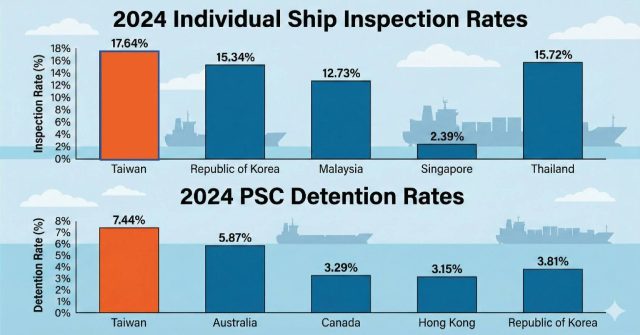 我國港口國管制作法亦接軌東京備忘錄機制,檢查率及留置率顯著高於東京備忘錄成員平均值。此項成績不僅彰顯我國船舶監理制度與國際標準高度接軌,更展現政府維護航安與海洋環境之堅定決心。
